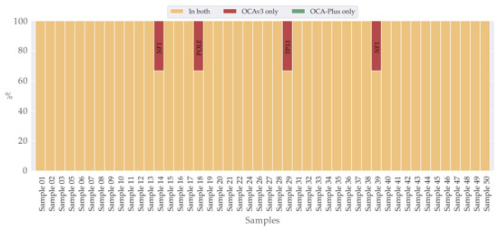 Overlap of identified variants in OCAv3 and OCA-Plus of clinical relevance. Stacked bar-chart of percentual overlapping locus variants of OCAv3 and OCA-Plus per samples; 42/46 samples overlapped completely, 4/46 showed difference in locus variants, hence only identified in OCAv3.