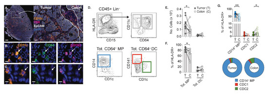 In the second cohort, frequencies and phenotypic activation of APCs were determined in cell suspensions of tumor, adjacent colon and peripheral blood mononuclear cells (PBMCs). In line with our in situ analyses, the lineage- HLA-DR+ CD11c+ APCs among total CD45+ leukocytes in tumor suspension comprised of CD64+ MPs and CD64- DCs, which, hereafter, are referred to as MPs and DCs, respectively (Figure 1D). The majority of MPs co-expressed CD14, and DCs contained the CD141+ CDC1 and CD1c+ CDC2 subsets. Relative to colon, MPs were significantly more prominent in the tumor (Figure 1E,F), as previously described [9,31]. A similar elevation in frequency or number of intratumoral DCs was not observed. At the subset level, CD14+ MPs remained elevated in the tumor, and the percentage of CDC2 was significantly decreased in the tumor, along with a slight increase in CDC1 (Figure 1G). Both tumor and colon had a large proportion of CD14+ MPs within the HLA-DR+ APCs, and CDC2 were proportionally higher than CDC1 in colon (Figure 1G). Collectively, these analyses show alterations in the composition of APCs subsets in tumors compared to the adjacent colon.