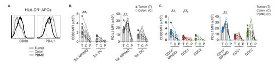 Expression of CD80 and PD-L1 on intratumoral and colonic APCs. (A) Histograms representing staining of CD80 or PD-L1 on total APCs in Tumor (T), Colon (C), and PBMCs (P). Mean fluorescence intensity (MFI) of CD80 and PD-L1 on total MPs or monocytes (MOs) and DCs (B), or on CD14+MPs/MOs, CDC1 and CDC2 (C). Bars show the mean. Connecting lines indicate autologous samples. (** p < 0.01, Wilcoxon test).