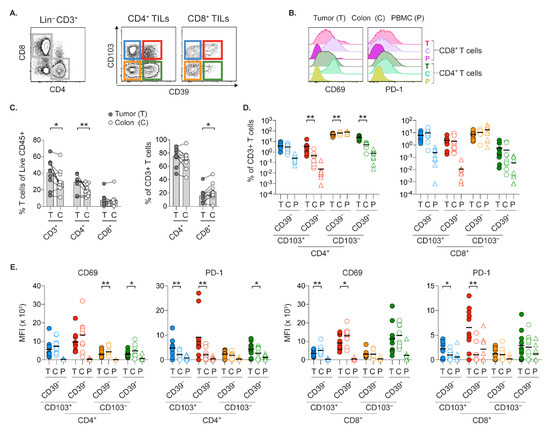 Phenotypic assessment of TILs and colonic T cells. (A) Gating strategy on tumor suspension where (CD11c/CD15/CD19)- CD3+ TILs are separated into CD4+ vs. CD8+ T cells and from which, four T cell subsets are subsequently defined by CD103 and CD39 expression. (B) Histogram overlays of CD69 and PD-1 staining on CD4 vs. CD8 T cells at specified sites. (C) Percent of total CD3+ T cells and CD4 or CD8 T cells within indicated population. (D) Percent of T cell subsets defined by CD103 and CD39 within CD3+ T cells. (E) MFI of CD69 and PD-1 staining on indicated T cell subsets and sites. Bars and bold horizontal line show the mean. Connecting lines indicate autologous samples. (* p < 0.05, ** p < 0.01, Wilcoxon test).