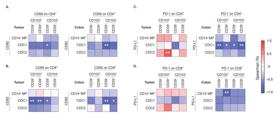 Correlation analyses showed that associations between CD80 on APC subsets vs. CD69 on T cell subsets defined by CD103 and CD39 were generally negative in the tumor and colon (Figure 4A,B). In contrast, PD-L1 on intratumoral CD14+ MPs tended to be positively linked to PD-1 expression on CD4 and CD8 TIL subsets (Figure 4C,D), but an opposite trend was observed in the colon. This may suggest that MPs in the tumor support PD-1-mediated T cell inhibition, but colonic MPs prefer to reduce signals conveyed by PD-1.