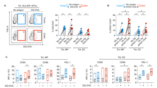 Protein uptake and degradation capacity of APCs from tumor and colon. (A) Flow cytometry plots on HLA-DR+ APCs with values indicating percent of APCs that degraded DQ-OVA protein (i.e., DQ-OVA+), and compiled data on DQ-OVA+ MPs and DCs. (B) Percent of MPs and DCs that ingested and/or degraded AF647-conjugated OVA. (C) Comparison of CD80, CD86 and PD-L1 MFIs on MPs and DCs in DQ-OVA–cultures that degraded DQ-OVA (DQ-OVA+), or not (DQ-OVA–). Bars and bold line in min-max bars show the mean. Connecting lines show control and treated cell suspension from the same patients. (* p < 0.05, Wilcoxon test).