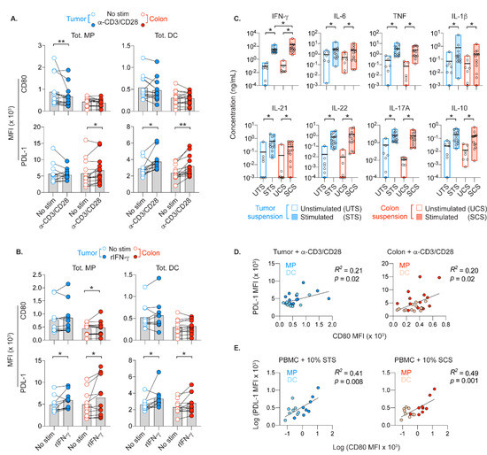 CD80 and PD–L1 expression on APCs in the presence of induced T cell activation. CD80 and PD–L1 MFI on MPs and DCs in tumor or colon suspensions after 6 h culture in media alone, or with microbeads loaded with anti-CD2/CD3/CD28 antibodies (referred to as microbeads) (A), or recombinant IFN-γ (B). (C) Cytokine levels after 6 h of culture. UTS and STS denote supernatants from unstimulated and microbeads-stimulated tumor suspensions, respectively. Likewise, supernatants from colon suspensions are referred to as UCS and SCS. Linear regression analyses of CD80 vs. PD–L1 MFI of APCs in microbeads-stimulated tissue suspensions (D), or in PBMCs exposed to 10% STS or SCS (E). Bars and bold line in min–max bars show the mean. Connecting lines show control and treated cell suspensions from the same patients (* p < 0.05, ** p < 0.01, Wilcoxon test).
