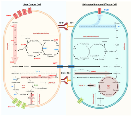 Metabolic reprogramming of liver cancer cells and exhausted immune effector cells in the tumor microenvironment. Liver cancer cells have increased glycolysis flux, as well as increased expression of Glut1, rate-limiting enzymes HK2, PFKL, and PKM2 (red). Glutaminolysis and fatty acids synthesis are the other two main pathways important for tumor cell survival and proliferation. While the TCA cycle and fatty acid oxidation, as well as the rate-limiting enzymes like SDH, FH, MDH, and CPT1A (blue) are downregulated in liver cancer cells. Metabolites, such as lactate, can be exported and influence the tumor infiltrated immune cells. In addition, tumor cell expressing PD-L1 can activate PD-1 on immune cells, inhibiting glucose uptake (Glut1) and Glycolysis (HK2). Dysregulated glycolysis, increased fatty acid oxidation and OXPHOS are the main metabolic phenotypes of exhausted immune effector cells.