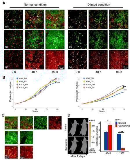 The competition between subpopulations mostly occurs under resource-constrained conditions, such as space and nutrition constraints [19,20,21]. Here, the competition between H1975/GFP and A549/RFP was tested in the above two aspects. The overall growth performance of H1975/GFP and A549/RFP separately and mixed culture at 0, 48, 96 h was shown in (Figure 1A), and details of each time point were in Supplementary Figure S1. The corresponding growth curve was shown in (Figure 1B). The left panel showed the cells in a normal culture medium with obvious space constraints in the later stage, and the right panel showed the condition of the cells in a diluted culture medium. The proliferation multiple was defined as the number of cells for subpopulation at each time point divided by the number of cells at the initial time. Multivariate analysis of variance followed by a post-hoc Bonferroni test showed that mixed culture would affect the growth of the two cell lines under space or nutrition constraints. Moreover, the effect of mixing two cell lines was stronger in the case of diluted culture than in the case of limited space.