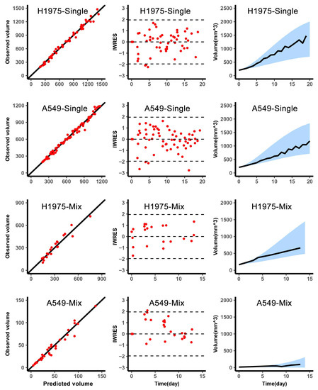 Graphical diagnostics of a single and mixed growth of H1975 and A549 growth in vivo. Observations versus individual predictions for H1975 in single (top, n = 6), A549 in single (second row, n = 7), H1975 in mixed (third row, n = 10), A549 in mixed (bottom, n = 10). Each row includes lines of identity (left), individual-weighted residuals (IWRES) versus time (middle), and the predicted volume versus time (right). In the subplots of predicted volume versus time, the blue shaded area represents the 90% confidence interval of the simulated median value. The line represents the median of the observations.