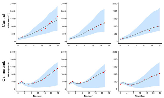 The efficacy of osimertinib in mixed tumors. The tumor volume change versus time for 3 samples in each group (top, control group, n = 10; bottom, osimertinib administration group, n = 3). In each subplot, the red dot represents the observed volume of mixed tumor, the line represents the individual prediction by simulation using the individual empirical Bayes estimates, the blue shaded area represents the 90% confidence interval of individual prediction.