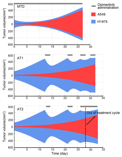 Reachability-based adaptive therapy (AT2): The start of the treatment cycle was the same as AT1. However, if the tumor volume reduction was less than 100 mm3 with two days osimertinib administration, the treatment cycle would be interrupted and osimertinib would not be withdrawn. As for the reason for 100 mm3, it was explained in the results.