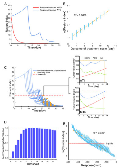 According to the model, a parameter ‘restore index’ was introduced for better integration the adaptive therapy and MTD. In this system, it is calculated as following equation [5]. The numerator of restore index was the instantaneous reduction rate of H1975 under osimertinib administration, and the denominator was the instantaneous proliferation rate of A549. It would be used to quantitatively evaluate the system reachability because the drug response of H1975 indicated the degree to which the system can be directly regulated, and combined with the proliferation ability of A549 reflected the final effect of the direct regulation of the system. The change of this index versus therapy time was shown in (Figure 5A), where the simulated case of AT1 and MTD was the same as (Figure 4). The changing trend of the restore index was consistent with the composition of the tumor. The setting of this index took into account the drug effect on the tumor and the intrinsic growth rate of resistant cells, so this index can reflect the tumor response of the treatment well. To clarify its ability to predict the outcome of the treatment cycle, we simulated tumors with different aggressiveness resistant subpopulations, whose intrinsic growth rate was defined as 50–200% relative to the typical value of H1975 and carrying capacity was defined as 80–200% relative to the typical value of H1975. And this simulation was adopted with AT1 therapy, the restore index at the start of each treatment cycle and the duration of the corresponding treatment cycle was recorded to analyze the correlation (Figure 5B). Furthermore, this correlation was verified in a public dataset on a prospective trial of intermittent androgen suppression [26]. The model was adopted from the study by West JB et al. [7], and after the model was fitted, the restore index of each patient at the start of treatment cycles 3–5 was calculated. Then the correlation of restore index and duration of treatment cycle was shown in Supplementary Figure S4. The good correlation between the logarithmic restore index and the outcome of the treatment cycle confirmed the effect of this index. Therefore, the restore index was an appropriate indicator for evaluating whether to interrupt the treatment cycle.