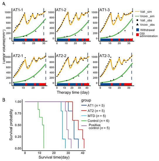 Comparison of therapies in animal experiments. (A) Tumor volume versus therapy time in the experiment. The first row contains three samples from the AT1 group, the second row contains three samples from the AT2 group. The black dots were the observations of total volume, and the black triangles were the observations of A549 volume. The yellow curves were the simulation results of total volume, and the green curves were the simulation results of A549 volume. The red and blue color bands below the curves represent the administration and withdrawal of osimertinib, respectively. The gray dashed line indicates the endpoint. (B) Survival curves of the Positive control, Control, MTD, AT1, and AT2, the difference between groups is performed by pairwise comparisons use Log-Rank test and shown in Table 1.
