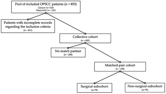 Retrospective data were obtained from patient records of 853 patients with OPSCC who were treated with curative intent at the department of otolaryngology, head and neck surgery of the University Hospital Giessen (n = 618) or at the department of otolaryngology University Hospital Maastricht (n = 235) between the years 2000 and 2015. Diagnosis of OPSCC was based on the International Classification of Diseases for Oncology ((ICD-O); C09, C10). The individual therapy recommendation was made on an interdisciplinary basis in a head and neck tumor board. Whenever possible surgical and non-surgical approaches were offered to each patient. The final decision as to which therapy was chosen, however, depended on regional preferences, which was reflected in an increased rate of the surgical approach in Giessen and an increased rate of radiation therapy in Maastricht. Due to the long-term retrospective nature of our analysis, we cannot present detailed data regarding individual treatment regimens. However, all patients received guideline-compliant therapy at the time of first diagnosis. Furthermore, all surgically treated patients underwent open surgery, as transoral robotic surgery was not yet established at the participating centres at that point. Written informed consent was obtained from all patients. The study was approved by the Ethics Committee of Giessen (AZ 95/15) and Maastricht (METC 11-29-14). Tumour staging and histological grading was assessed according to the 7th edition of the International Union against Cancer (UICC) TNM classification and the WHO criteria for squamous cell carcinomas of the oral mucosa [4,6]. A schematic diagram displaying the workflow of our study is presented in Figure 1.