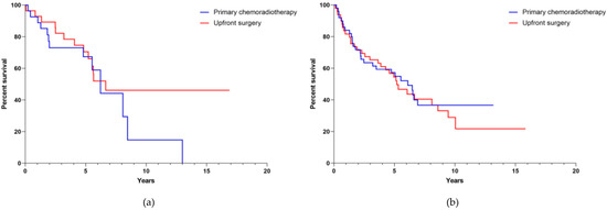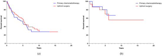 The median survival for the entire collective cohort was 6.2 years (CI 5.027–7.406), whereas for the subgroup treated with upfront surgery in the collective cohort it was 11.2 years (CI 8.362–13.994) versus 4.1 years (CI 2.990–5.284) in the subgroup treated with primary chemoradiation, respectively (Figure 2a, p ≤ 0.001). The median survival for the entire matched-pair cohort was 6.1 years (CI 5.230–6.989), whereas for the matched-pair group treated with upfront surgery it was 5.6 years (CI 4.342–6.940) and 6.5 years (CI 5.218–7.724) for the subgroup treated with primary chemoradiation. The two-year estimated OS was 72.4% for the subgroup treated with upfront surgery and 77.9% for the subgroup treated with primary chemoradiation, respectively. Five-year OS was estimated as 61% in patients treated with upfront surgery and 60.3% for patients treated with primary chemoradiotherapy (Figure 2b, p = 0.760).