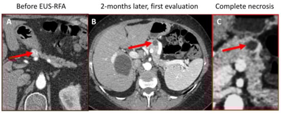 - Barthet, M.; Giovannini, M.; Lesavre, N.; Boustiere, C.; Napoleon, B.; Koch, S.; Gasmi, M.; Vanbiervliet, G.; Gonzalez, J.-M. Endoscopic Ultrasound-Guided Radiofrequency Ablation for Pancreatic Neuroendocrine Tumors and Pancreatic Cystic Neoplasms: A Prospective Multicenter Study. Endoscopy 2019, 51, 836–842. [Google Scholar] [CrossRef] [PubMed]