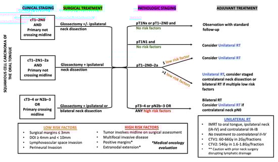 - Lillie, O.; Amdur, R.J.; Morris, C.G.; Hitchcock, K.E.; Mendenhall, W.M. Challenging the Requirement to Treat the Contralateral Neck in Cases With > 4 Mm Tumor Thickness in Patients Receiving Postoperative Radiation Therapy for Squamous Cell Carcinoma of the Oral Tongue or Floor of Mouth. Am. J. Clin. Oncol. 2019, 42, 89–91. [Google Scholar] [CrossRef]