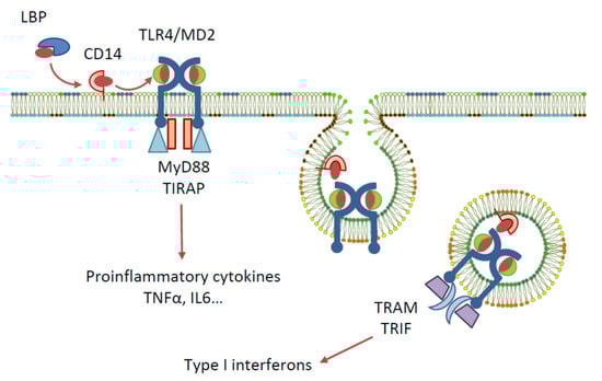 Toll-like receptors (TLRs) are a family of pattern recognition receptors first identified in Drosophila, and to date, ten members of the TLR family are recognised in humans [1]. One of the most widely studied TLRs is TLR4, a membrane-bound receptor that has an extracellular leucine-rich repeat domain, a transmembrane domain, and a cytoplasmic toll/interleukin-1 receptor (TIR) domain [2]. Among other pattern recognition receptors, TLR4 plays a role in the innate immune system by recognising various pathogen-associated molecular patterns (PAMPs) and damage-associated molecular patterns (DAMPs), and by triggering host defences to produce inflammatory cytokines, eliminating the cause of danger [3]. The activation of TLR4 by natural ligand lipopolysaccharide (LPS)—a PAMP contained in gram-negative bacteria cell membranes—requires the involvement of the following accessory proteins: lipopolysaccharide binding protein (LBP), the cluster of differentiation antigen 14 (CD14), and myeloid differentiation protein 2 (MD-2) [4] (Figure 1). Signal transduction is initiated by the binding of LPS to LBP, which traffics it to CD14. CD14 then binds to the cell and delivers LPS to the TLR4-associated MD-2. The detection of LPS by TLR4 causes the dimerisation of the TLR4 cytoplasmic TIR domain, which can then recruit different sets of adaptor proteins and initiate two downstream signalling pathways: the MyD88- and TRIF/TRAM-dependent pathways. Triggering of the MyD88-dependent signalling pathway activates the transcription factors NF-κB, IRF5, AP-1, and CREB, and the subsequent production of pro-inflammatory cytokines. The endocytosis of the TLR4 complex, however, recruits the TRIF/TRAM pathway, resulting in the activation of IRF-3 and the production of type I interferons, or, alternatively, the activation of NF-κB via RIP1 kinase interactions with TRAF6 and the production of cytokines [5,6].