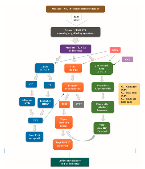 | Thyrotoxicosis | G 1: Continue ICPi with frequent TFT. G 2: May hold ICPi until resolution of symptoms. Administer b- blockers. Hydration and supportive care. Thyrotoxicosis >6 wk, or clinical suspicion of GD: Diagnostic work-up for GD. Treat GD as indicated, preferably starting with thionamide. G 3–4: As in G2. For severe symptoms: