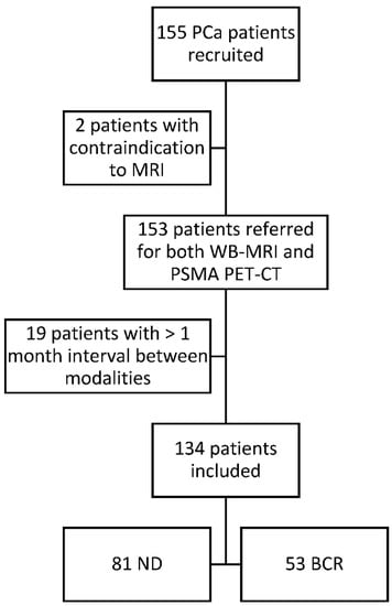 Study flow chart. All patients were diagnosed with biopsy-proven prostate cancer and all patients underwent a WB-MRI and a PSMA PET-CT at the University Clinic Saint-Luc Brussels from August 2016 to November 2019. PCa: prostate cancer; WB-MRI: whole body magnetic resonance imaging; PSMA PET-CT: prostate specific membrane antigen positron emission tomography; ND: newly diagnosed; BCR: biochemical recurrence.