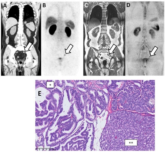 Discordant findings between PSMA PET/CT and WB-MRI/DWI: false negative observation of metastatic lymph node by WB-MRI/DWI in 62-year-old patient with prostate cancer at BCR (rapidly rising PSA up to 3.5 ng/mL after radical prostatectomy and pelvic irradiation). (A,B) PSMA PET/CT: reformatted coronal CT (A) and PET (B) images show unique 10 mm radiotracer-positive (SUVmax 12) left iliac lymph node considered as metastatic on the PET image (arrows in (A,B)). (C,D) WB-MRI/DWI images: corresponding reformatted high resolution T1 (C) and diffusion-weighted (D) MRI images show single left lymph node (arrows in (C,D)) that was not considered as metastatic based on its size (small diameter < 10 mm). (E) Hematoxylin and eosin stained section of resected node after robotic-assisted salvage lymphadenectomy shows the presence of a PCa metastasis with a mixed intra-ductal (*) and cribriform (**) morphology (original magnification ×300; scale bar in lower left corner).