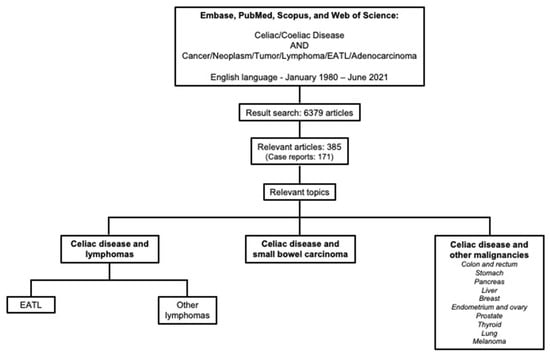 A literature search from the bibliographic databases of Embase, PubMed, Scopus, and Web of Science was performed using the following keywords: (“Celiac Disease” OR “Coeliac Disease”) AND (“Cancer” OR “Neoplasm” OR “Tumor” OR “Lymphoma” OR “EATL” OR “Adenocarcinoma”). Initially, 6379 papers written in English and published between January 1980 and June 2021 were identified. In order to assess the appropriateness for the study’s aim, titles and abstracts of the papers were evaluated by the authors and 385 articles (171 case reports) relating to malignancy in CeD were finally selected and read in full. Paper references were checked to ensure that all potentially relevant articles were retrieved and examined in detail (Figure 1). The articles were categorized by topic and summarized according to their content.