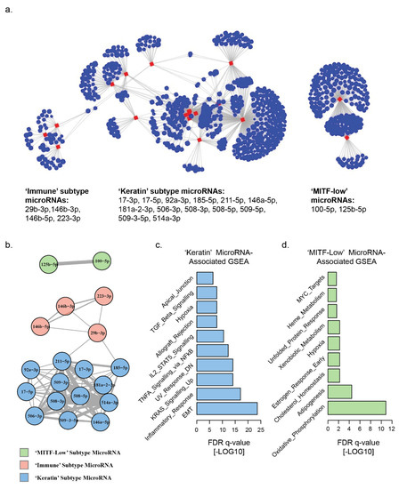 To verify our findings from the TCGA melanoma dataset and to clarify the microRNA–mRNA signatures most likely to originate from melanoma cells, we repeated our analysis on a panel of 61 patient-derived early-passage melanoma cell lines from a cohort of patients treated at our institution [37,38]. In this dataset, we identified 4489 microRNA–mRNA associations, involving 81 microRNAs which were inversely correlated with the expression of at least one mRNA (Spearman’s rho <−0.6) (Figure S2a, Table S4). These microRNAs included 2/2 ‘MITF-low’-, 10/13 ‘keratin’- and 1/4 ‘immune’-associated microRNAs that were identified in the original analysis of TCGA melanoma metastatic lesions [27]. Of the 81 microRNAs, 18 were associated with >100 mRNAs each, which accounted for 2748/4489 (61%) of the total microRNA–mRNA inverse correlations (Table S4). Bipartite and unipartite network projections of these 18 microRNAs identified two distinct network hubs (Figure 2a,b and Figure S2b), based on ‘keratin’ and ‘MITF low’ microRNAs. The lack of an ‘immune’-cluster-associated microRNA hub in this cell-line-derived data potentially suggests a reduced contribution from melanoma cells—compared with other cellular elements present in tumors—to the ‘immune’ transcriptomic phenotype. The ‘MITF-low’ network hub comprised the same two microRNAs (miR-100-5p and miR-125b-5p) as were identified in our network analysis of TCGA melanoma tumors and accounted for 308/4489 (7%) of the total microRNA–mRNA inverse correlations in this dataset. This hub was, again, completely separate from the rest of the network (Table S4). The larger hub accounted for 2440/4489 (50%) of the total microRNA–mRNA inverse correlations in this dataset and shared some ‘keratin’ hub microRNAs, including miR-17-3p, 185-5p and 211-5p. However, this hub did not exclusively contain ‘keratin’ microRNAs (6/16), but also ‘immune’ microRNAs (2/16) and eight microRNAs unaffiliated to any TCGA melanoma transcriptomic subtype. The GSEA of the mRNAs which were inversely correlated with the larger network identified striking similarities with the enrichments seen in our analysis of the TCGA melanoma ‘keratin’ network, sharing 6 of the top 10 enriched gene sets, including EMT, UV-response DN, apical junction, TNFA signaling via NFkB, hypoxia and TGF-beta signaling (Table S6). The equivalent GSEA of mRNAs inversely correlated with the ‘MITF-low’ microRNA network in cell lines shared 2/10 enriched gene sets with the TCGA melanoma ‘MITF-low’ network, including estrogen early response and adipogenesis.