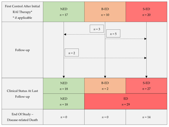 In the first diagnostic control after RAI therapy, three subgroups of patients could be identified—patients with NED highlighted in green, B-ED in orange and S-ED in red (see Figure 1). The NED-subgroup consisted of 17/47 patients. In 4/17 patients, I-131 uptake in the thyroid bed was diagnosed in the WBS without detectable Tg or a pathological 18F-FDG uptake in the PET/CT scan and, thus, corresponding to non-pathological, remnant thyroidal tissue. In these patients, an additional second course of RAI therapy was performed, and patients counted among the NED group until the last follow-up. Ten of forty-seven patients showed B-ED with a mean stimulated Tg of 13.1 ng/mL (0.8–85.7 ng/mL) without pathological findings in the WBS. In 2 of these 10 patients, I-131 uptake in the thyroid bed was detected without corresponding findings in the 18F-FDG-PET/CT scan, confirming non-pathological remnant thyroidal tissue. The S-ED group consisted of 20/47 patients with I-131 uptake in the WBS found in 12 patients (lung = 7, remnant thyroidal tissue = 4, bone = 3, liver = 1). The 18F-FDG-PET/CT scan at the first diagnostic control was performed in 16/20 patients and confirmed distant metastases in all patients. In addition, further distant metastases (lung = 3, lymph node = 3, pleura = 1) could be detected. In two of four patients with I-131 uptake in the thyroid bed, local disease could be confirmed in the 18F-FDG-PET/CT scan. In all remaining patients of the S-ED, as well as the B-ED and NED group, the 18F-FDG-PET/CT scan was performed either at the initial presentation (as reported in the patient characteristics section) or at the 3-month follow-up. The mean stimulated Tg in patients of this group was 1134.7 ng/mL (<0.05–10,063.0 ng/mL). Seven patients did not receive a first diagnostic control due to extended metastatic disease diagnosed by the WBS or 18F-FDG-PET/CT scan at initial RAI therapy. Two patients died before first the diagnostic control. In two patients, systemic therapy (tyrosine kinase inhibitor, TKI) was initiated immediately after initial RAI therapy.