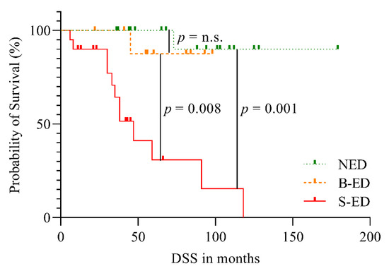Kaplan–Meier estimate of DSS in the NED, B-ED and S-ED groups; DSS, disease-specific survival; ED, evidence of disease; N, no; B, biochemical; S, structural, n.s., not significant.