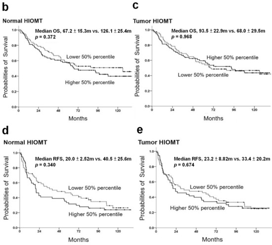 Intracellular L-tryptophan (Trp) is catabolized to several metabolites in a cell-selective manner. Some bioactive metabolites, notably Kyn, serotonin and melatonin were recognized to possess cancer-regulatory actions [7,8,9,10]. 5-methoxytryptophan (5-MTP), a new member of Trp metabolites, was reported to be a cyclooxygenase-2 (COX-2) suppressing factor, and was named cytoguardin [11,12]. It inhibits A549 cancer cell migration, invasion and epithelial mesenchymal transition and attenuates cancer growth and lung metastasis in a murine xenograft tumor model [13,14]. 5-MTP is produced in human vascular endothelial cells, smooth muscle cells and fibroblasts [15]. Its synthesis is catalyzed by tryptophan hydroxylase-1 (TPH-1) which converts Trp to 5-hydroxytryphan (5-HTP) and hydroxyindole O-methyltransferase (HIOMT), which converts 5-HTP to 5-MTP [13]. HIOMT (also known as acetylserotonin methyltransferase, ASMT) is encoded by a single gene. Three mRNA isoforms are expressed in pineal tissues as a result of alternative splicing [16,17]. Full-length ASMT codes for a 373-amino acid (aa) protein (isoform 373) while exon 6-spliced isoform codes for a 345 aa protein (isoform 345). Exon 6 and 7-spliced isoform codes for a 298-aa protein (isoform 298) [16,17]. Isoform 345 was reported to be the functional enzyme for melatonin biosynthesis [18]. By contract, human ECs and fibroblasts express a truncated HIOMT isoform with sequence identify to ASMT298 (HIOMT298) [19]. Cancer cells also express HIOMT298, albeit at a much lower level than normal cells. Transfection of A549 cells with HIOMT298 or HIOMT373 restores HIOMT catalytic activity and 5-MTP production [19]. Analysis of HIOMT expression in human colorectal, pancreatic and breast cancer tissues reveal reduced HIOMT expression in a majority of cancer tissues [19]. Whether HIOMT acts as a clinical biomarker in any cancer type has not been reported. HIOMT expression in HCC has not been reported. The purpose of this study is to determine whether HCC tissue HIOMT levels may be a cancer biomarker. HCC was selected for this study because of availability of HCC tissues from a prospective multi-center HCC longitudinal study organized by the Taiwan Liver Cancer Network (TLCN) [20]. Serum samples were also available for analysis of 5-MTP and other Trp metabolites including Kyn, serotonin, melatonin, 5-HTP and Trp. The results reveal that tumor HIOMT mRNA and serum 5-MTP in combination with serum Kyn are correlated with long-term survival of HCC following therapeutic hepatectomy.