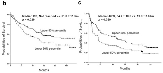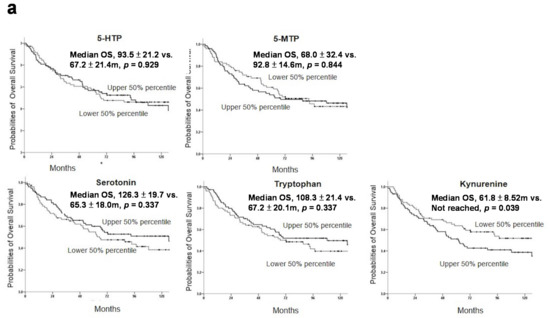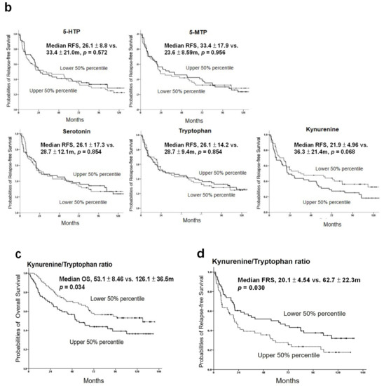 As the participants had a long follow-up period (median follow-up was 114.7 months), we were able to determine whether serum Trp metabolites are associated with long-term survival. Serum 5-MTP was not associated with overall of RF survival (shown in Figure 4a,b). Similarly, neither serotonin nor 5-HTP or Try was associated with survival (shown in Figure 4a,b). By contrast, serum Kyn levels were significantly associated with overall survival (shown in Figure 4a). The Kyn values at the upper 50th percentile had a significantly lower survival than that at the lower survival (61.8 ± 8.52 months vs. > 120 months) (shown in Figure 4a). Kyn level was also associated with RF survival (shown in Figure 4b). Kyn/Trp ratio was used as a surrogate marker of IDO-1. We analyzed the association of Kyn/Trp ratio with HCC survival. Kyn/Trp ratio at the lower 50th percentile had a significantly longer overall and RF survival than that at the upper 50th percentile (shown in Figure 4c,d). Compared to individual Kyn analysis, the Kyn/Trp ratio provided a better discrimination of overall and RF survival.