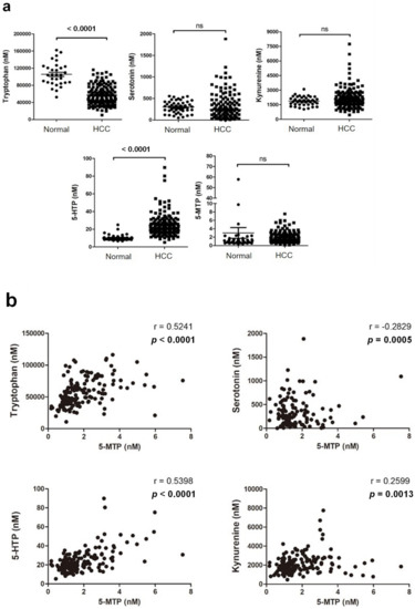 5-MTP and a selected group of Trp metabolites including Trp, 5-hydroxytryptophan (5-HTP), 5-hydroxytryptamine (5-HT, serotonin), melatonin and Kyn in serum samples of 150 HCC patients collected at the time of therapeutic hepatectomy were analyzed by LC-tandem MS. Sera from 47 healthy subjects were included as a reference. Serum 5-MTP levels of HCC patients were not significantly different from that of healthy subjects (shown in Figure 3a). Serum 5-MTP values in HCC patients show a large standard deviation (shown in Table S1) ranging from 0.17 to 7.54 nM. Other bioactive metabolites i.e., serotonin and Kyn in HCC patients were not different from those in healthy subjects (shown in Figure 3a). Serum melatonin was below the detection limit of the assay (shown in Table S1). By contrast, serum Trp level was reduced and 5-HTP level was increased in cancer patients when compared to those in healthy subjects (shown in Figure 3a). The range of serum Trp (10.78–116.32 μM) and 5-HTP (5.19–89.82 μM) was wide, consistent with large variations of the serum values among HCC patients (shown in Table S1). These results suggest that Trp is consumed in HCC for production of Kyn via the IDO/TDO pathway and 5-HTP and its downstream metabolites via the TPH pathway. Serum 5-MTP was positively correlated with Trp and 5-HTP and negatively correlated with serotonin (shown in Figure 3b). Surprisingly, serum 5-MTP was positively correlated with serum Kyn (shown in Figure 3b). These results suggest that HCC influences serum Trp metabolites by a complex regulatory mechanism involving alteration of IDO/TDO and TPH pathways.