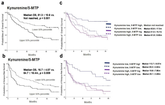 As Kyn and 5-MTP possess opposite effects on cancer growth, we determined the association of Kyn/5-MTP ratio with HCC clinicopathological features and survival. A high ratio was associated with older age, alcohol drinking and cigarette smoking (shown in Table S2). A Kyn/5-MTP ratio at the upper 50th percentile was associated with a short overall survival when compared to that at the lower 50th percentile (median 51.3 ± 10.5 months vs. >120 months) (shown in Figure 5a). Kyn/5-MTP ratio provides a more clear separation of survival prediction between high and low values. Kyn/5-MTP at the upper 50th percentile also had a shorter survival than Kyn/5-MTP at the lower 50th percentile but the difference in RF survival between these two groups is not as distinct as that in overall survival (shown in Figure 5b). We next determined whether individuals with a low Kyn and a high 5-MTP have a survival advantage. Individuals with low Kyn (lower 50th percentile) and high 5-MTP (upper 50th percentile) had a very long overall survival (shown in Figure 5c). High Kyn + high 5-MTP had an overall survival curve similar to high Kyn + low 5-MTP or low Kyn + low 5-MTP (shown in Figure 5c). A low Kyn and high 5-MTP confers a long RF survival (median survival: 113.7 ± 9.57 months) (shown in Figure 5d). These results suggest that a low serum Kyn + a high serum 5-MTP is predictive of very long survival and possible cure after therapeutic hepatectomy for HCC.