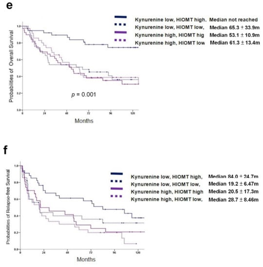 Combined serum Kyn and tissue HIOMT mRNA analysis predicted prolonged survival in a trend analogous to Kyn + 5-MTP combined analysis (shown in Figure 5e). Individuals with low Kyn and high HIOMT had >80% chance of overall survival over 10 years. They had a long median RF survival (84.0 ± 24.7 months) when compared to RF survival of high T/N HIOMT mRNA (54.7 ± 18.5 months) or low Kyn (36.3 ± 21.4 months) alone (shown in Figure 5f). These results suggest that combined Kyn/5-MTP or Kyn/HIOMT analysis is useful in identifying long survival after therapeutic hepatectomy.