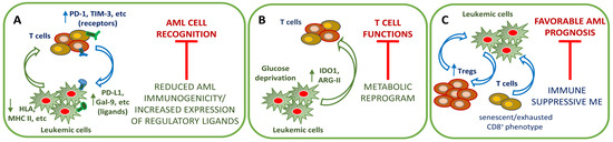 Interactions between AML cells and T cells potentially mediate therapy resistance. (A) Intrinsic immune evasion mechanisms adopted by AML cells to escape immune system recognition and destruction (green). These mechanisms include the reduction of AML immunogenicity (e.g., genomic loss of HLA haplotype, downregulation of MHC class II gene expression) and expression of regulatory ligands, such as PD-L1 and Gal-9 on AML cells interacting with their IRs on immune cells (PD-1, TIM-3). (B) AML cell aberrant metabolism, through the expression of metabolic enzymes (e.g., ARG-II and IDO1), leads to glucose deprivation, amino acid starvation, accumulation of kynurenines, etc., affecting T cell functions. (C) The immunologic status of AML patients at diagnosis, including an increased number of Tregs in PB and BM and an exhausted and senescent phenotype of CD8+ cells, has been associated with poor prognosis in AML patients. HLA, human leukocyte antigens; MHC, major histocompatibility complex; PD-L1, programmed death-ligand 1; Gal-9, Galectin-9; PD-1, programmed cell death protein 1, TIM-3, T cell immunoglobulin and mucin domain 3; ARG-II, arginase; IDO1, indoleamine 2,3 dioxygenase; ME, microenvironment.