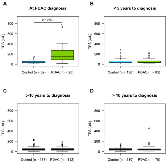 TPS levels in plasma samples stratified by time to PDAC diagnosis. The TPS levels were compared between cases and controls (A) at diagnosis (p-value from logistic regression model adjusted for age), (B) <5 years, (C) 5–10 years, and (D) >10 years prior to diagnosis.