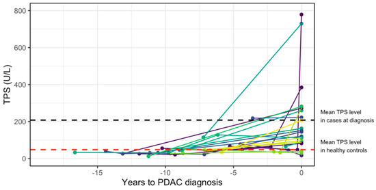 TPS levels were also analyzed in longitudinal samples, that is, samples taken from the same individual prior to diagnosis and at diagnosis (Figure 4), in 22 individuals. A trend where circulating TPS levels increase at time of PDAC diagnosis was observed. Of note, one PDAC patient already had elevated TPS levels (>200 U/L) 3.6 years prior to PDAC diagnosis and survived for 57 days after diagnosis date. No further statistical analyses were conducted, however, due to the low number of samples and differences in sampling time points.