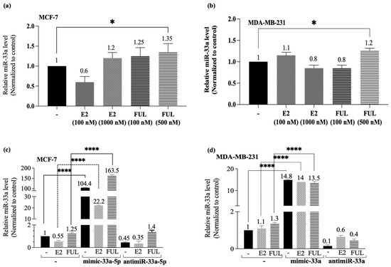 Treatment of cells with mimic-33a increased its expression in MDA-MB-231 cells in the presence of both E2 and FUL. We suggested that due to the ERα−/ERβ+ characteristics of MDA-MB-231 cells, E2 or FUL treatment did not affect the miR-33a level directly. Similarly, anti-miR-33a significantly decreased miR-33a expression both in E2 and FUL treatment (Figure 2d).