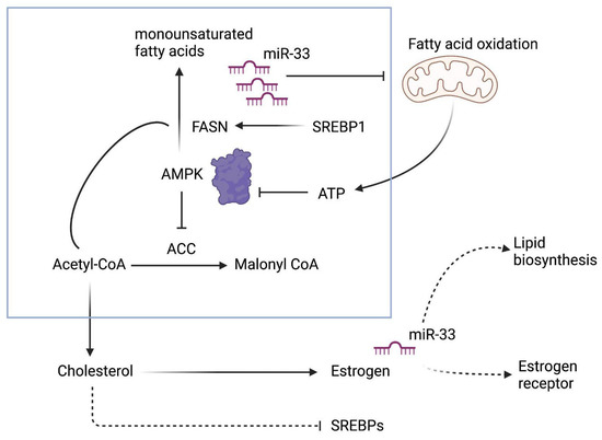 (1) Background: Increased fatty acid synthesis leads to the aggressive phenotype of breast cancer and renders efficiency of therapeutics. Regulatory microRNAs (miRNAs) on lipid biosynthesis pathways as miR-33a have potential to clarify the exact mechanism. (2) Methods: We determined miR-33a expression levels following exposure of MCF-7 and MDA-MB-231 breast cancer cells to estrogen receptor (ER) activator (estradiol-17β, E2) or anti-estrogens (ICI 182,780, Fulvestrant, FUL) at non-cytotoxic concentrations. We related miR-33a expression levels in the cells to cellular lipid biosynthesis-related pathways through immunoblotting. (3) Results: miR-33a mimic treatment led to significantly downregulation of fatty acid synthase (FASN) in MCF-7 cells but not in MDA-MB-231 cells in the presence of estradiol-17β (E2) or Fulvestrant (FUL). In contrast to the miR-33a inhibitor effect, miR-33a mimic co-transfection with E2 or FUL led to diminished AMP-activated protein kinase α (AMPKα) activity in MCF-7 cells. E2 increases FASN levels in MDA-MB-231 cells regardless of miR-33a cellular levels. miR-33a inhibitor co-treatment suppressed E2-mediated AMPKα activity in MDA-MB-231 cells. (4) Conclusions: The cellular expression levels of miR-33a are critical to understanding differential responses which include cellular energy sensors such as AMPKα activation status in breast cancer cells.