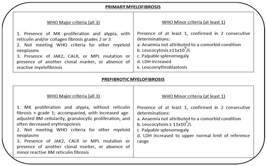 Current practice utilizes for diagnosis the revised 2016 WHO diagnostic criteria for overt PMF and pre-MF encompassing three major and at least one minor criteria specific to histological, mutational, clinical, and laboratory-based features [2,15] (Figure 1).