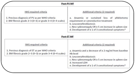 Summary of IWG diagnostic criteria for post polycythaemia myelofibrosis (post-PV MF) and post essential thrombocythemia myelofibrosis MF (post-ET MF). Abbreviations: Hb = hemoglobin; LDH = lactate dehydrogenase; PV = polycythemia vera; ET = essential thrombocythemia; BM = bone marrow; IWG = International Working Group. * Constitutional symptoms: >10% weight loss in 6 months, night sweats, and unexplained fever (>37.5 °C). Adapted from Arber et al. Blood 2016 [2] and Gowin et al. Leuk Res 2015 [15].