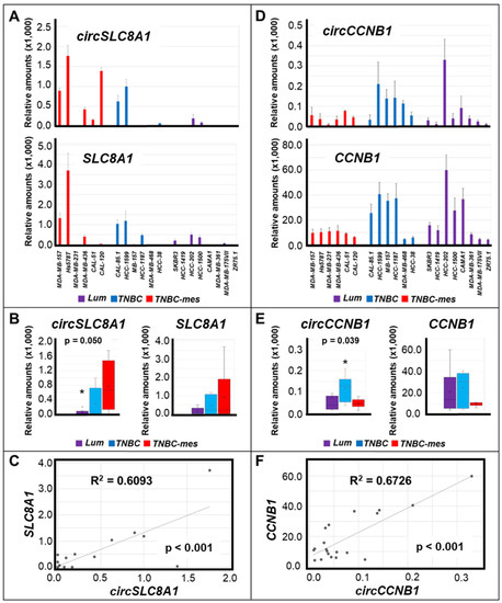 Within the group of 11 circRNAs showing upregulation in mesHMLE cells (Table 1), circSLC8A1 and circCCNB1 were found to be differentially expressed in the Lum, TNBC, and TNBC-mes groups (Figure 1). The levels of circSLC8A1 were significantly higher in TNBC-mes than in Lum cell lines (Figure 1A,B).
