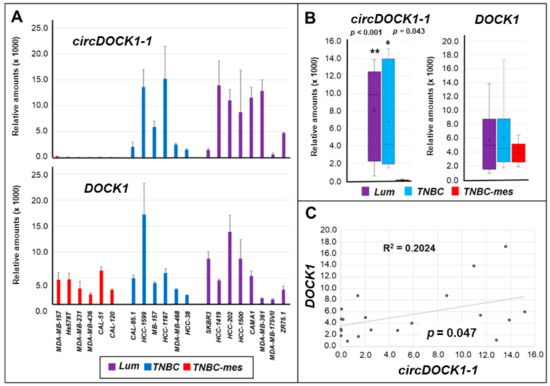 Expression of circDOCK1-1 RNA and the corresponding linear DOCK1 mRNA in breast cancer cell lines. Total RNA was extracted from the indicated cell lines and the levels of circDOCK1-1 RNA (upper graph) and DOCK1 mRNA (lower graph) were measured by PCR in the indicated cell lines (A). Each value is the mean ± SD of 3 independent cultures. (B) The panel illustrates the box plots generated from the median expression levels of circDOCK1-1 RNA and DOCK1 mRNA determined in Lum, TNBC, and TNBC-mes cell lines and it summarizes the results shown in (A). ** Significantly higher in the Lum relative to the TNBC-mes group, as indicated (p < 0.001; Student’s T-test). * Significantly higher in the TNBC relative to the TNBC-mes group (p = 0.043; Student’s t-test). (C) The panel illustrates the correlations between the mean expression of circDOCK1-1 RNA and DOCK1 mRNA in each cell line. The calculated R2 correlation value (Pearson method) and the correlation p-value are indicated.