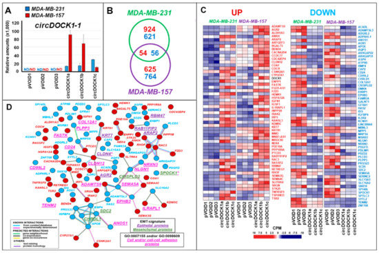 We subjected the MDA-MB-231- and MDA-MB-157-derived cells to RNA-seq analysis. In both MDA-MB-231 and MDA-MB-157 cells, where more than 24,000 RNAs were identified, circDOCK1-1 overexpression caused limited perturbations on the gene expression profiles (Figure 3B). In MDA-MB-231 cells, circDOCK1-1 was found to upregulate 978 and downregulate 677 transcripts (Table S3 and Figure S10A). In MDA-MB-157 cells, circDOCK1-1 upregulates 679 and downregulates 820 mRNAs (Table S3 and Figure S10B). The RNA-seq results were validated in both MDA-MB-231 and MDA-MB-157 for two upregulated (CYP27A1; SEMA3G) and two downregulated (IGFBP4; SDC2) genes using PCR (Figure S11). circDOCK1-1 overexpression upregulates 54 (including DOCK1) and downregulates 56 of these mRNAs in both MDA-MB-231 and MDA-MB-157 (Figure 3C and Table S3). Using the STRING database (https://string-db.org, accessed on 10 April 2021), we defined 10 “protein-interaction-networks”, five of which contain gene products involved in cell adhesion and cell–cell interactions (Figure 3D). This is consistent with the ssGSEA data that we obtained with the 110 genes regulated by circDOCK1-1 in both MDA-MB-231 and MDA-MB-157 cells (Table S3) that show an enrichment of elements belonging to the GO:0007155 (Cell Adhesion) and GO:0098609 (Cell-cell Adhesion) Gene Ontology pathways.