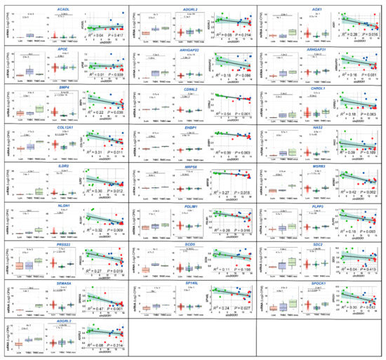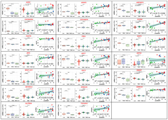 To confirm the data, we evaluated the expression of the up-/downregulated transcripts in TNBC-mes/TNBC/Lum cell lines and established correlations between the levels of these mRNAs and circDOCK1-1 in each cell line. As for the upregulated transcripts, the levels of 20 mRNAs, including AGR2, ARAP2, CLDN4, KRT7, and RBM47, tended to be lower in TNBC-mes than Lum cell lines (Figure 4, left box-plots). In 15 cases, this was accompanied by a significant direct correlation (R2 > 0.1) with circDOCK1 expression in TNBC-mes, TNBC, and Lum cell lines (Figure 4, right diagrams). Moreover, the expression profiles of AGR2, ARFGEF3, CACNA2D4, CDC42EP4, FZD3, RBM47, RETREG1, and SEMA3G reflect the situation observed in primary mammary tumours (Figure 4, middle box-plots; TCGA RNA-seq data). Finally, the amounts of the 11 mRNAs tend to be larger in TNBC-mes than Lum cell lines (Figure S12), while 22 genes are characterized by similar levels of expression in TNBC-mes and Lum cell lines (Figure S13).