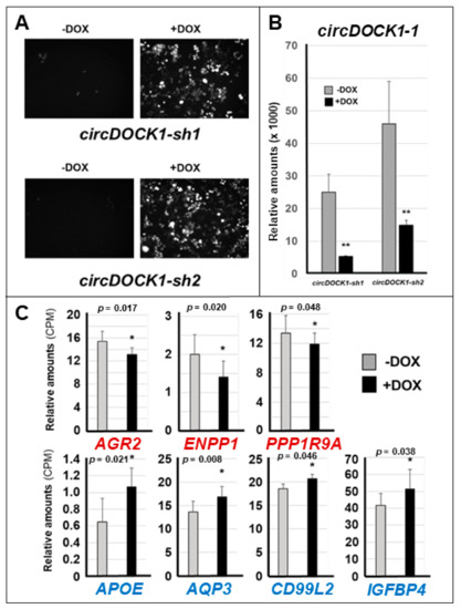 Effects of circDOCK1-1 silencing in CAMA-1 cells on the expression of genes whose expression is modulated by circDOCK1-1 overexpression. Luminal CAMA-1 cells were infected with a retroviral construct, which allows doxycyclin (DOX)-dependent silencing of circDOCK1-1. Following infection, two independent cell populations (circDOCK1-sh1 and circ-DOCK1-sh2) were isolated. (A) The figures show that the two cell populations express significant levels of the circDOCK1-1 targeting constructs only following exposure to DOX, as indicated by the positivity of cells to the Red Fluorescent Protein. (B) The column diagram shows the level of circDOCK1-1 expression as determined by RT-PCR analysis with a specific Taqman assay. ** Significantly lower than the corresponding vehicle-treated (−DOX) sample (p < 0.01 following Student’s t-test). No significant difference was observed between the −DOX circDOCK1-sh1 and circ-DOCK1-sh2 groups. (C) The column graphs shows: (1) the levels of the indicated mRNAs that are significantly upregulated by circDOCK1-1 overexpression in both MDA-MB-231 and MDA-MB-157 cells and are marked in red (AGR2, MPP1, and PPP1R9A); (2) the levels of the indicated mRNAs that are significantly downregulated by circDOCK1-1 overexpression in both MDA-MB-231 and MDA-MB-157 cells and are marked in blue (APOE, AQP3, CD99L2, and IGFBP4). The results were obtained using RNA-seq following isolation of total RNA from triplicate cultures of the two cell populations exposed to vehicle or DOX and are expressed in CPM (counts per million reads). * Significantly different. The p-values of the −DOX vs. +DOX comparisons (Student’s t-test; N = 6) are shown.