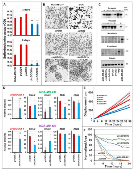 Effects of circDOCK1-1 overexpression on cell proliferation, morphology, EMT, random motility, and wound healing. Parental MDA-MB-231 as well as three derived cell populations stably transfected with a plasmid allowing the expression of circDOCK1-1 (circDOCK1a; circDOCK1b; circDOCK1c) and the corresponding void vector (pVOID1; pVOID2; pVOID3) were used for the experiments described in the various panels. (A) The proliferation of parental MDA-MB-231, pVOID1, pVOID2, circDOCK1a, and circDOCK1b cells was evaluated with the sulforhodamine assay. ** Significantly lower than parental MDA-MB-231, pVOID1, and pVOID2 (p < 0.001 Student’s t-test). (B) The images show the morphology of logarithmically growing parental MDA-MB-231, pVOID1, pVOID2, circDOCK1a, and circDOCK1b cells grown in optimal conditions on plastic dishes. Luminal MCF7 cells grown in the presence of oestradiol were used as a positive control for the luminal phenotype. (C) Total cellular extracts obtained from parental MDA-MB-231, pVOID1, pVOID2, circDOCK1a, and circDOCK1b cells grown under basal conditions were used to perform Western blot experiments with specific antibodies recognizing the indicated proteins. Protein extracts of the luminal T47D and the mesenchymal MDA-MB-436 cell lines were used as external controls for the experiments. The same amount of protein was loaded in each lane as indicated by the levels of tubulin shown. The numbers above each lane of the β-catenin and vimentin Western blots indicate the relative levels of the two proteins after densitometric analysis of the bands taking the values determined in parental MDA-MB-231 cells 1.0. All the values were normalized for the corresponding amounts of tubulin. (D) The diagrams illustrate the expression levels of the indicated mRNAs coding for proteins playing a positive action in the process of epithelial-to-mesenchymal transition (EMT) determined from the RNA-seq data obtained in the indicated pVOID1, pVOID2, pVOID3, circDOCK1a, circDOCK1b, and circDOCK1c populations. Each value is the Mean ± SD of the three indicated cell populations. ** Significantly different from the corresponding pVOID value (circDOCK1-1 in MDA-MB-231 cells, p < 0.001; circDOCK1-1 in MDA-MB-157 cells, p < 0.001; Student’s t-test). * Significantly different from the corresponding pVOID value (ZEB1 in MDA-MB-231 cells, p = 0.028; SNAI2 in MDA-MB-157 cells, p = 0.012; Student’s t-test). (E) The diagrams illustrate the random motility curves determined in parental MDA-MB-231, pVOID1, pVOID2, circDOCK1a, and circDOCK1b cells by time-lapse microscopy at the indicated time points. The motility curves of circDOCK1a and circDOCK1b cells are significantly lower than the corresponding curves generated from the data obtained with parental MDA-MB-231, pVOID1, and pVOID2 cells (p < 0.001 following two-way ANOVA Bonferroni post-test). (F) The diagrams show the wound-healing curves determined in parental MDA-MB-231, pVOID1, pVOID2, circDOCK1a, and circDOCK1b cells by time-lapse microscopy at the indicated time points. The values indicate the void area contained between the margins of the healing. The curves obtained with circDOCK1a and circDOCK1b cells indicate that the closure of the wound was slower than what was observed with parental MDA-MB-231, pVOID1 and pVOID2 cells (p < 0.001 following two-way ANOVA Bonferroni post-test).