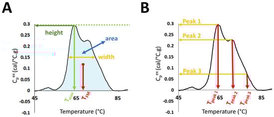 Selected DSC curve features evaluated in the study. (A) DSC curve peak width at half height; total area under the curve, maximum peak height; temperature of the peak maximum (Tmax); and first moment temperature, TFM. (B) Maximum excess specific heat capacity (Cpex) and position of Peaks 1, 2, and 3.