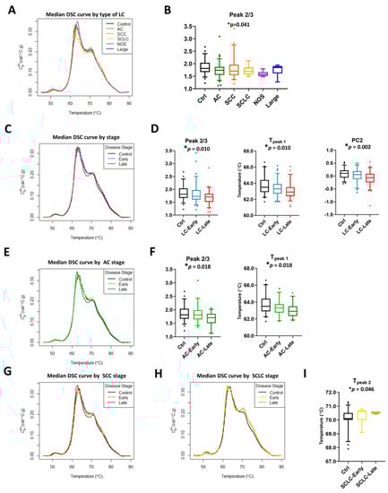 Subtypes and stage-related differences in DSC curves of LC specimens. (A) Plot of the median DSC curve value at each temperature for different subtypes of LC and control subjects. (B) Boxplots of selected summary metrics calculated from DSC curves for controls and different subtypes of LC patients. Plot of the median DSC curve value at each temperature for control subjects and early stage (stage 1–3a) or late stage (stage 3b–4) LC (C), AC (E), SCC (G), and SCLC (H) patients. Boxplots of selected summary metrics and PCs calculated from DSC curves for controls and early/late stage LC (D), AC (F), and SCLC (I) patients. *, adjusted p-value < 0.05.