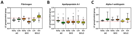 Glycosylation profiles of selected plasma proteins in control and lung cancer patient specimens. Examples of glycosylation levels of selected proteins involved in coagulation (A), transportation (B) or belonging to the serpins family (C) in patients with different stages of AC, SCC, and SCLC. Data are presented normalized to control values, (LC group)/(Control group). The dashed red line indicates the median value of control samples.