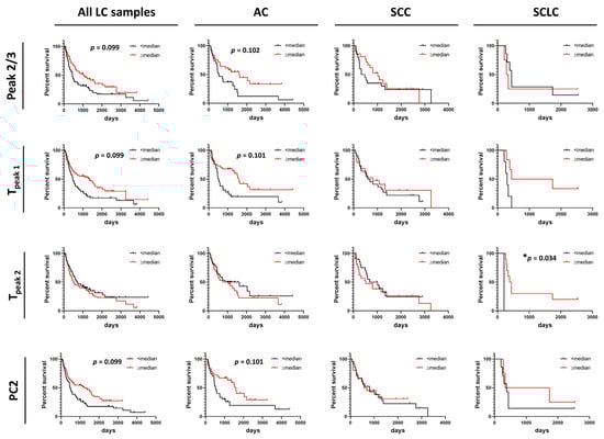 Summary metrics and/or PCs were evaluated for their use as predictors for progression-free survival (PFS) or overall survival (OS) of patients (Figure 5 and Figure 6 and Figures S11–S14). Data were dichotomized based on the value of each summary metric or PC into two groups: metric/PC values above or equal to the median value calculated for all 148 baseline LC specimens, metric/PC values below the median value calculated for all 148 baseline LC specimens. Survival functions were constructed for both PFS and OS for each of the 13 summary metrics and 6 PCs for the two groups (≥median, <median) for all LC patients combined, as well as by LC type (AC, SCC, SCLC). Detailed information about specimen data that were included in survival analysis can be found in Table S1. Additionally, we dichotomized specimens into two groups for values of Tpeak 1 and Tpeak 2 that fall within or outside the IQR (calculated for all LC specimens) to better understand the association of Peak 1 and Peak 2 positions with PFS and OS. After adjusting for multiple comparisons, no individual parameter was significant at the 5% level; however, our analysis indicated possible utility of Peak 2/3 (p-value = 0.014, adj. p-value = 0.099), Tpeak 1 (median; p-value = 0.008, adj. p-value = 0.099) and PC2 (p-value = 0.013, adj. p-value = 0.099) in predicting OS of LC patients (Figure 5) and would be of interest in future work with larger DSC data sets. Among LC subtypes, we found Tpeak 2 (based on median dichotomization) was significantly associated with OS in SCLC (p-value = 0.002, adj. p-value = 0.034; Figure 5). However, results of the survival analysis for the SCLC group should be treated with caution given the low sample size for this group, although the interesting trends can be pursued in future studies with larger patient numbers.