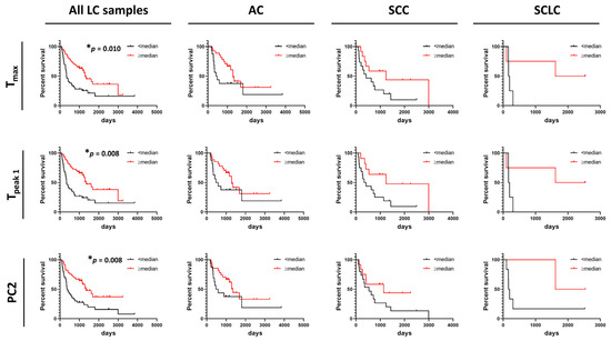 Association between overall survival of lung cancer patients and summary metrics or PCs. Analysis of survival functions for overall survival of lung cancer patients dichotomized by median values of selected summary metrics/PCs, using the Mantel–Cox test. Graphs in the first column represent data for all combined lung cancer patients (n = 133), columns two to four represent patients dichotomized by LC subtypes: AC LC (n = 66), SCC LC (n = 41) and SCLC (n = 11), respectively. *, adjusted p-value < 0.05.