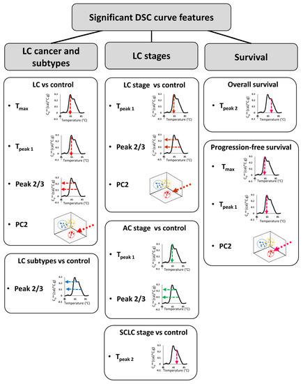 One potential method for screening and diagnosis of LC is differential scanning calorimetry (DSC). DSC curves reflect the heat change (excess specific heat capacity) in a fluid sample as it is heated, corresponding to the structural changes in the molecular constituents of the fluid as a function of temperature (e.g., protein denaturation). DSC curves have been shown to be a successful tool used in the diagnosis and characterization (e.g., progression or severity) of several cancers, including cervical cancer, breast cancer, colorectal cancer, multiple myeloma, and brain tumors [8,9,10,11,12,13,14]. In the current work, we evaluated the use of selected summary metrics and principal components (PCs) calculated from DSC curves for diagnosis and characterization of LC patients. Moreover, we evaluated their use as a potential predictor of progression-free and overall survival of patients.
